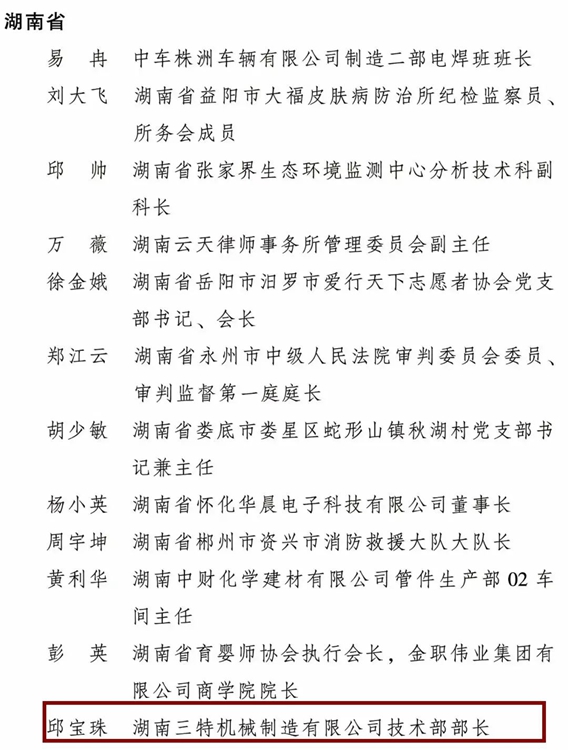 為表彰先進(jìn)、樹立榜樣,進(jìn)一步引領(lǐng)和激勵(lì)廣大婦女堅(jiān)定不移聽黨話、跟黨奮進(jìn)新征程,豪情滿懷、意氣風(fēng)發(fā)投入推進(jìn)中國式現(xiàn)代化的偉大實(shí)踐,日前,全國婦聯(lián)決定授予10人全國三八紅旗手標(biāo)兵稱號,298人全國三八紅旗手稱號,授予199個(gè)單位全國三八紅旗集體稱號,其中,來自桃源的湖南三特機(jī)械制造有限公司技術(shù)部部長 邱寶珠 獲得全國三八紅旗手榮譽(yù)。